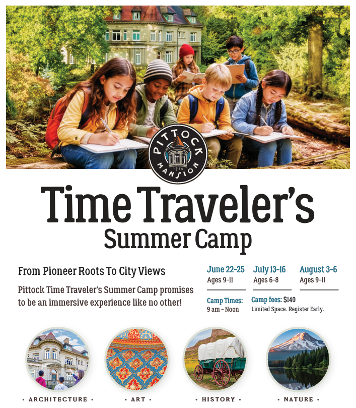 From pioneer roots to city views, Pittock Time Traveler’s Summer Camp promises to be an immersive experience like no other. This four-day camp will follow Pittock Mansion’s journey from natural wilderness to building plans for this spectacular house that was home for a family for decades. The Mansion will then begin to take shape in their own hands as they are introduced to art, building, and architecture through a variety of immersive historical activities. Campers will spend mornings for nature walks, print-making, painting, fun arts and crafts activities, games, and more as they explore how Pittock Mansion and the land around it has developed since the home was built in 1914. Come enjoy summer days at Pittock and learn what it took to create this historical landmark and how life has changed in these 100 plus years.